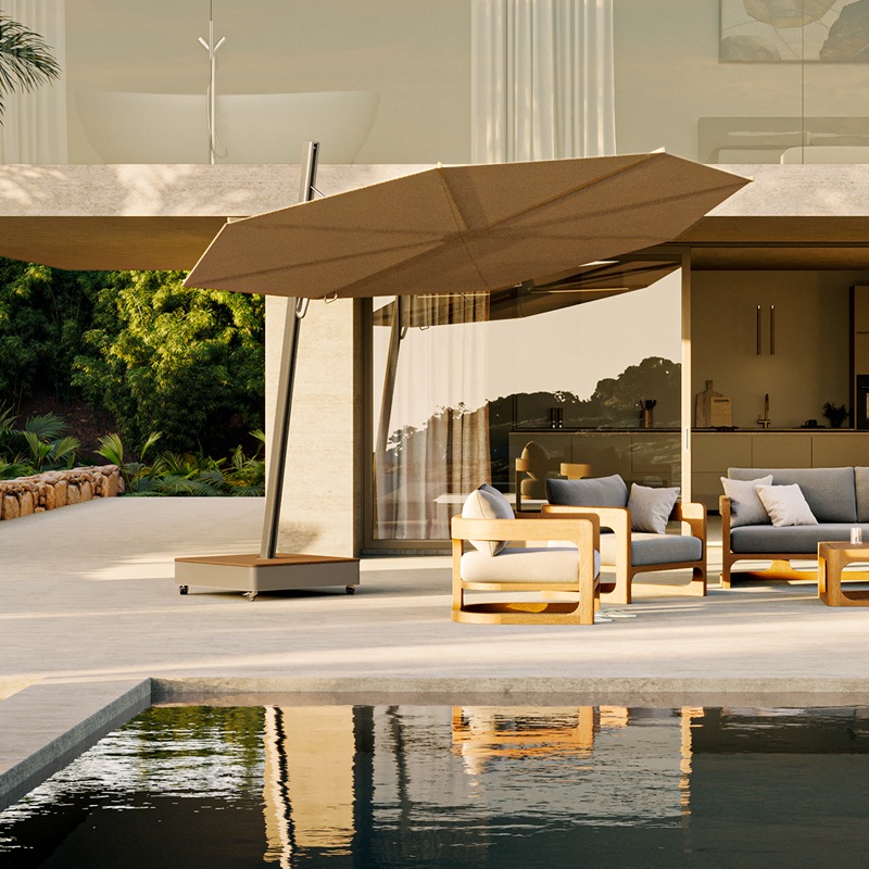 Die Besonderheit eines VERSA Sonnenschirms ist die Fächertechnologie, die eine einfache Schließung gegen den Mast ermöglicht.